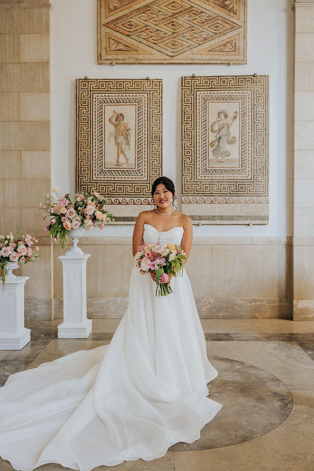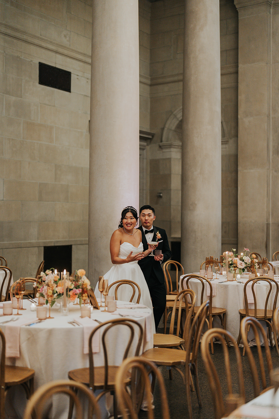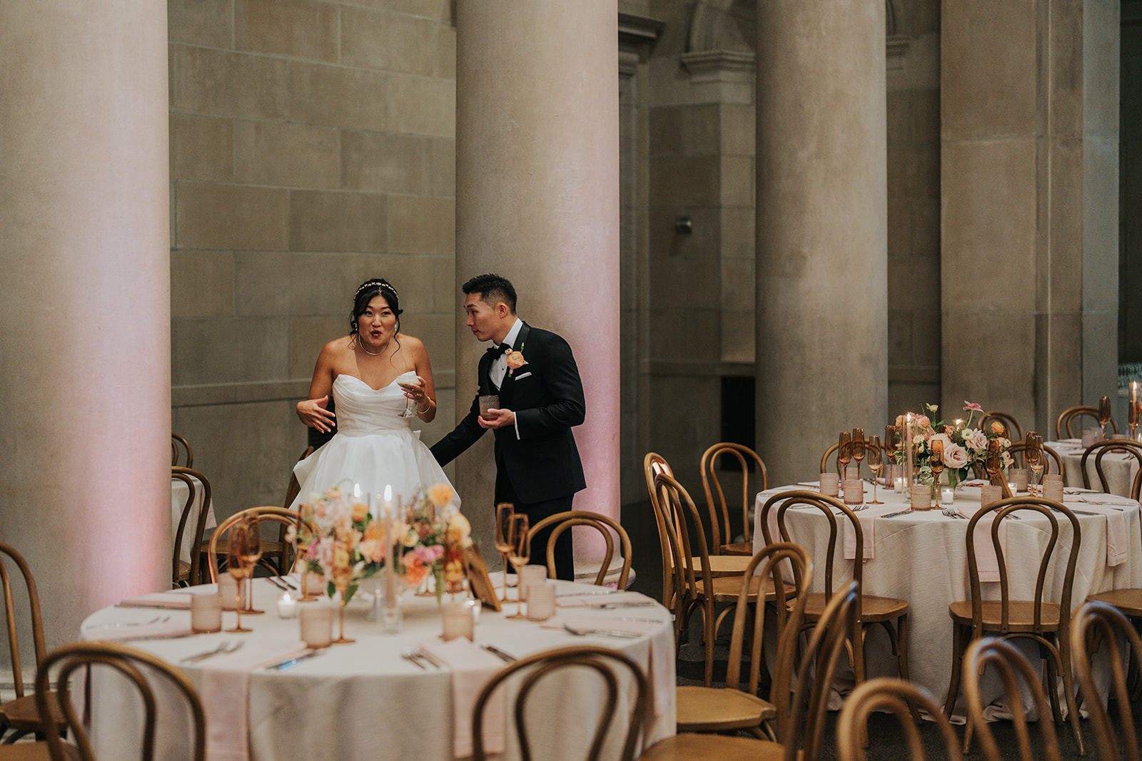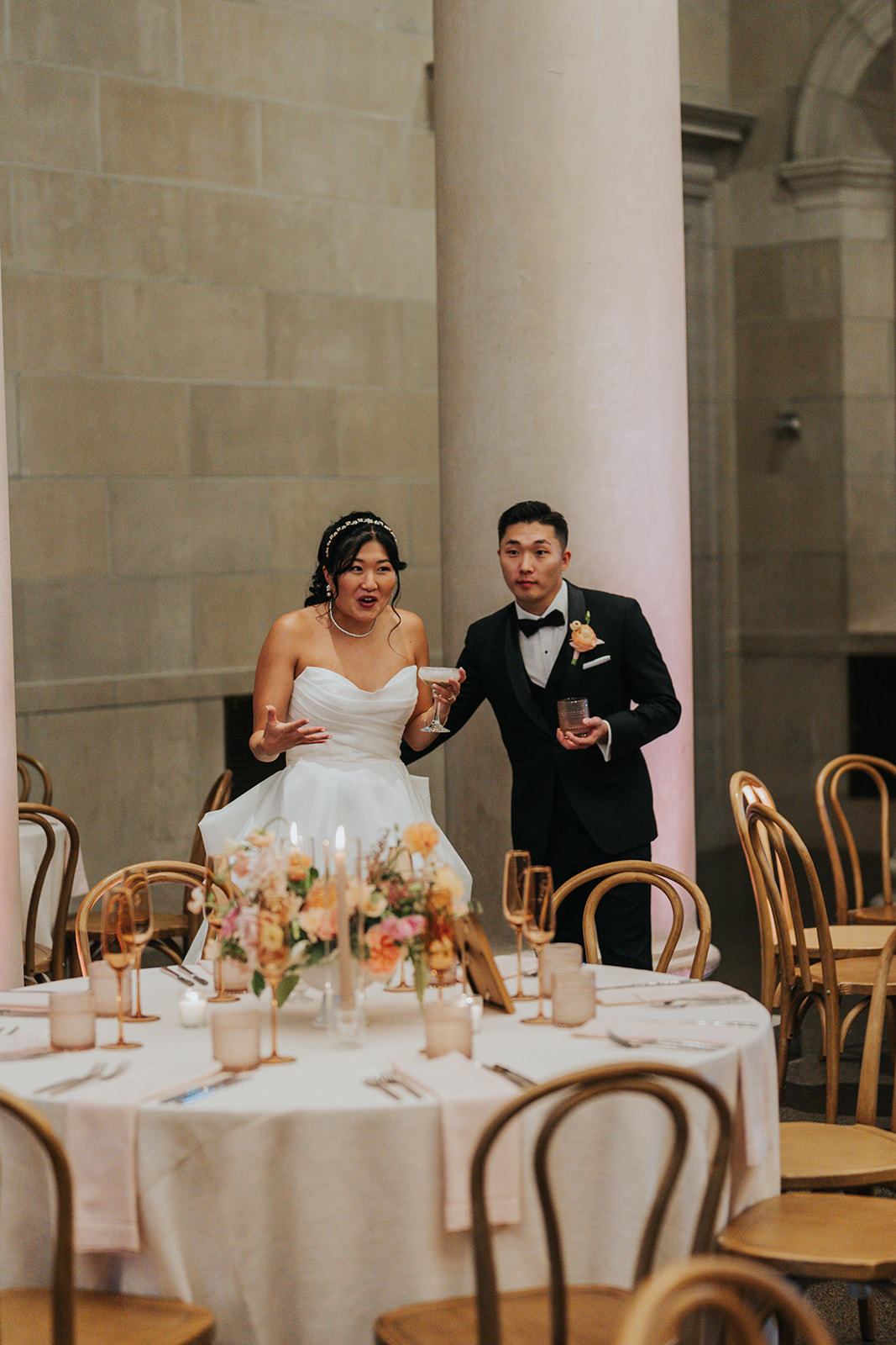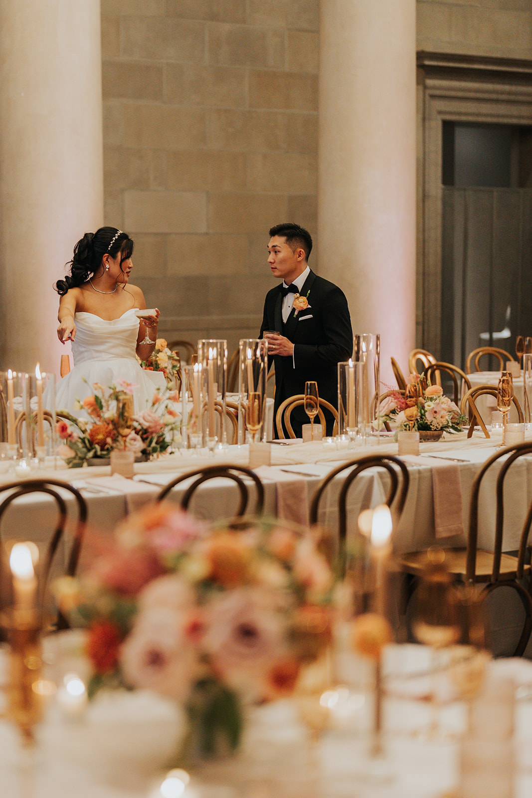 Suji & Kevin had so many lovely details in their elegant Baltimore Museum of Art wedding celebration. The soft color palette brought warmth throughout the marble space, as we used special touches like miss-matching colored glassware, mixed textures in the linens, and voluminous arrangements of summer-pastel flowers.