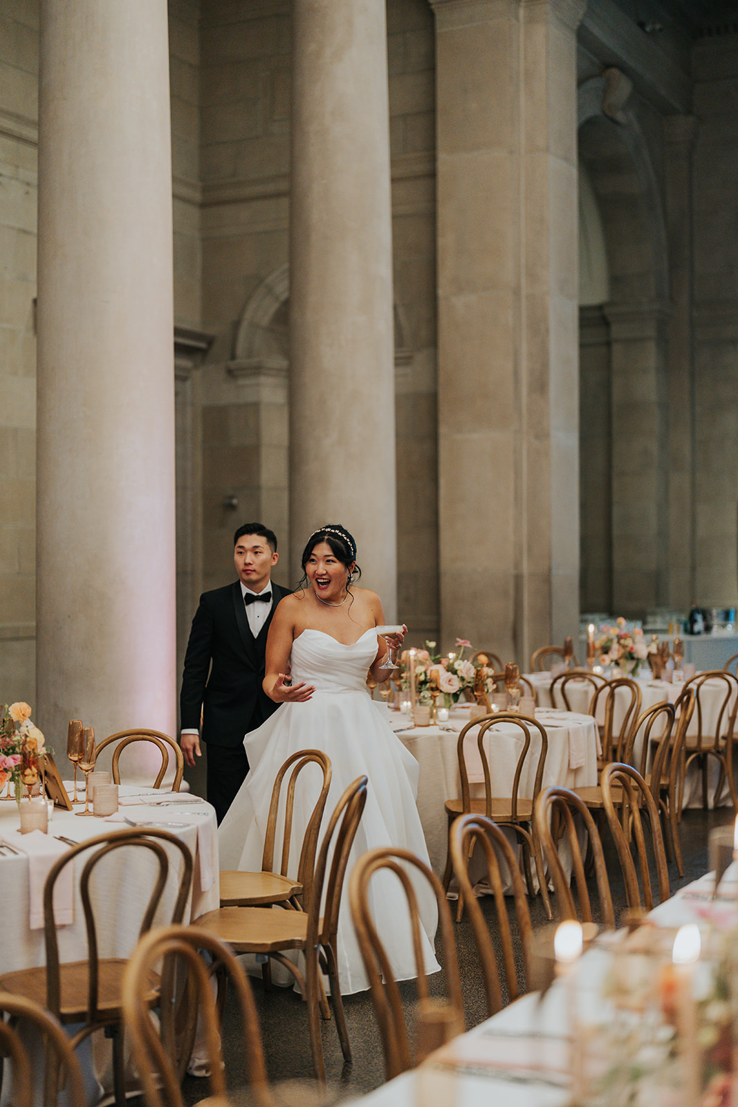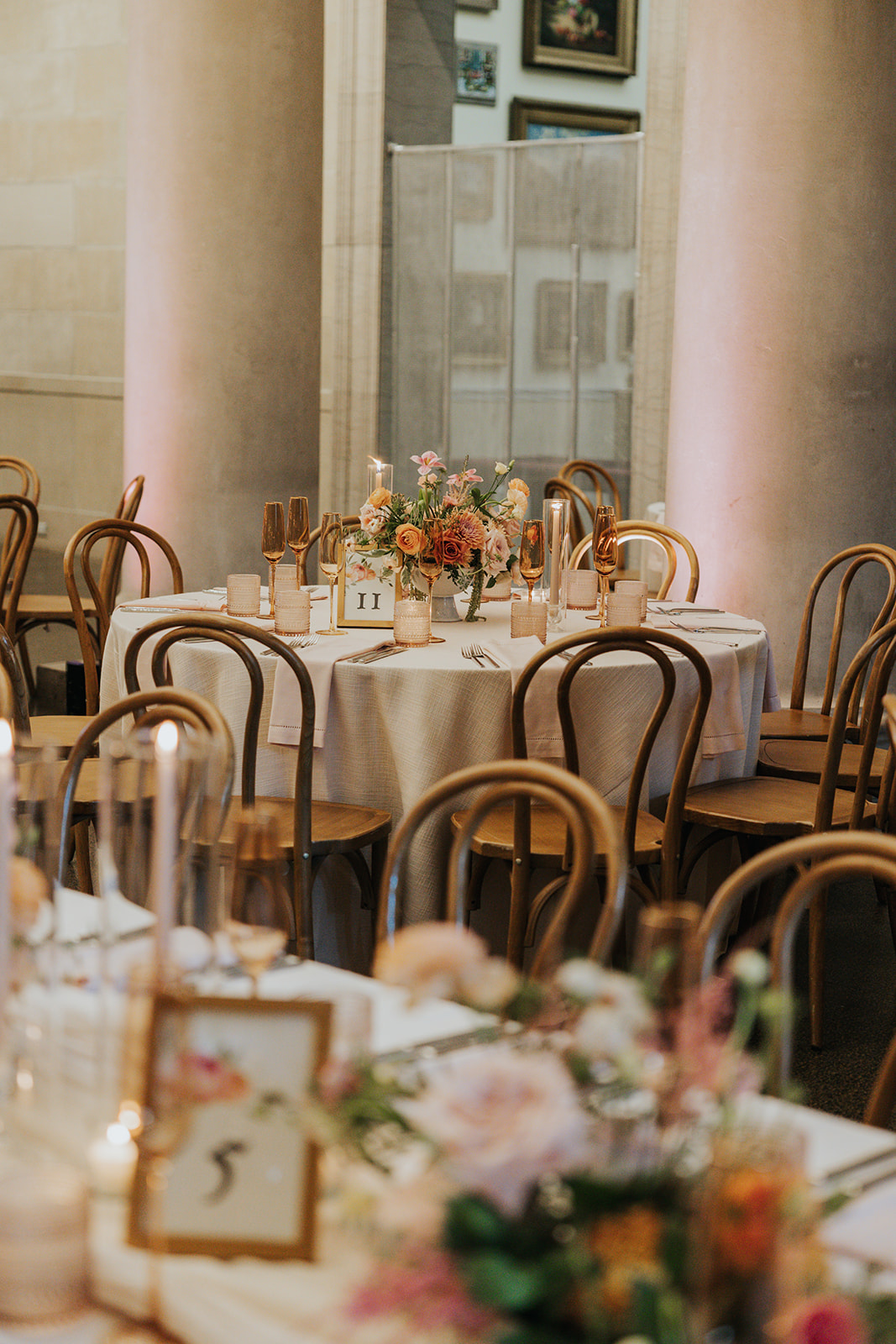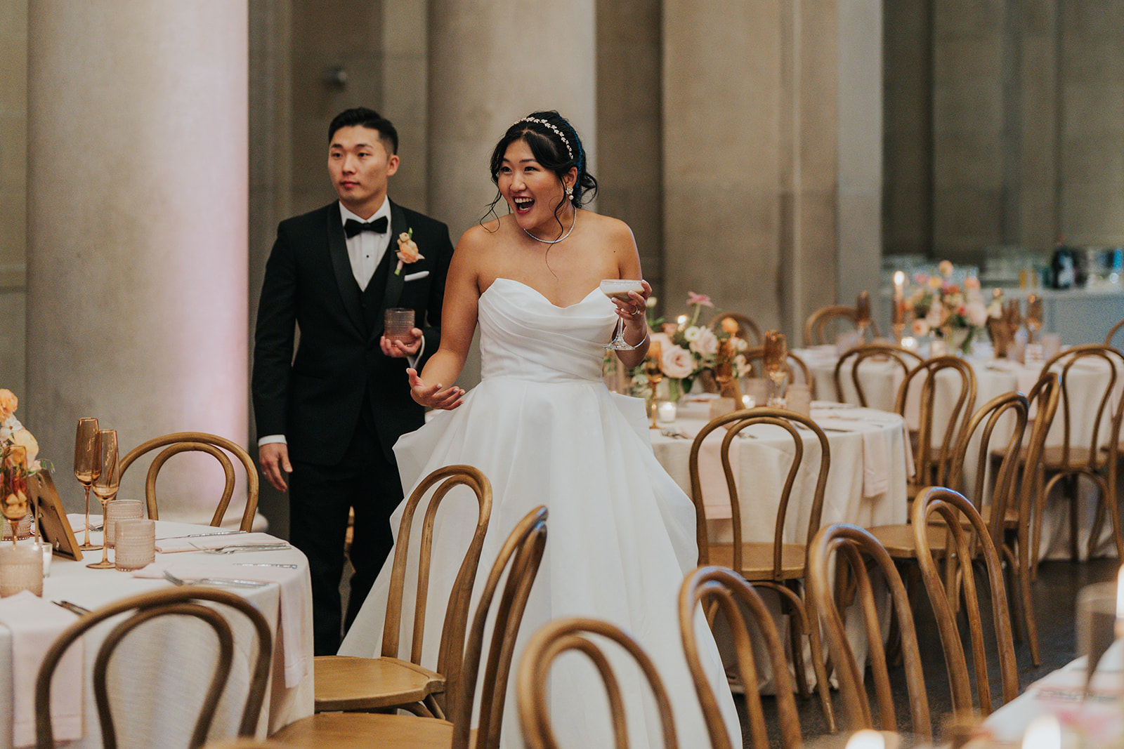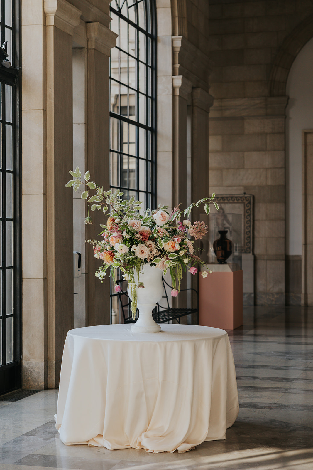 Suji & Kevin had so many lovely details in their elegant Baltimore Museum of Art wedding celebration. The soft color palette brought warmth throughout the marble space, as we used special touches like miss-matching colored glassware, mixed textures in the linens, and voluminous arrangements of summer-pastel flowers.
