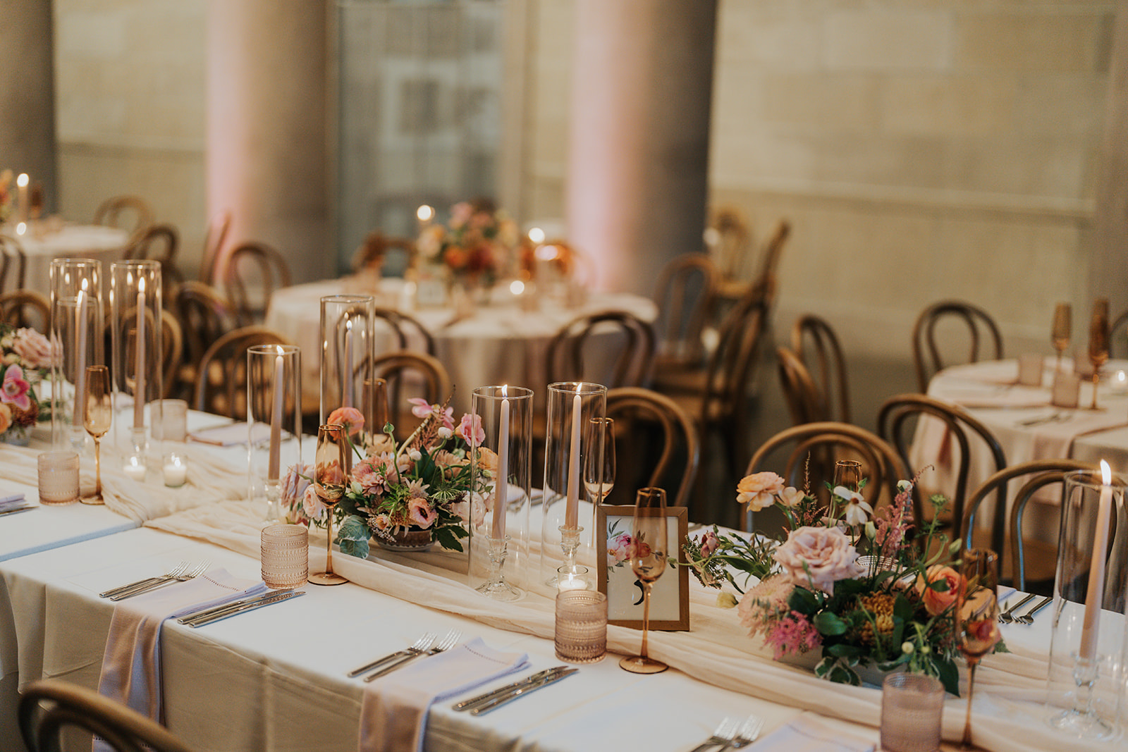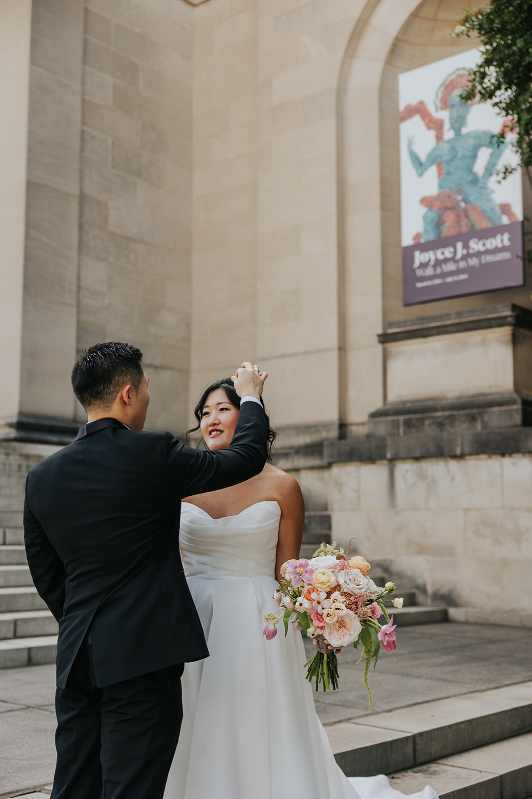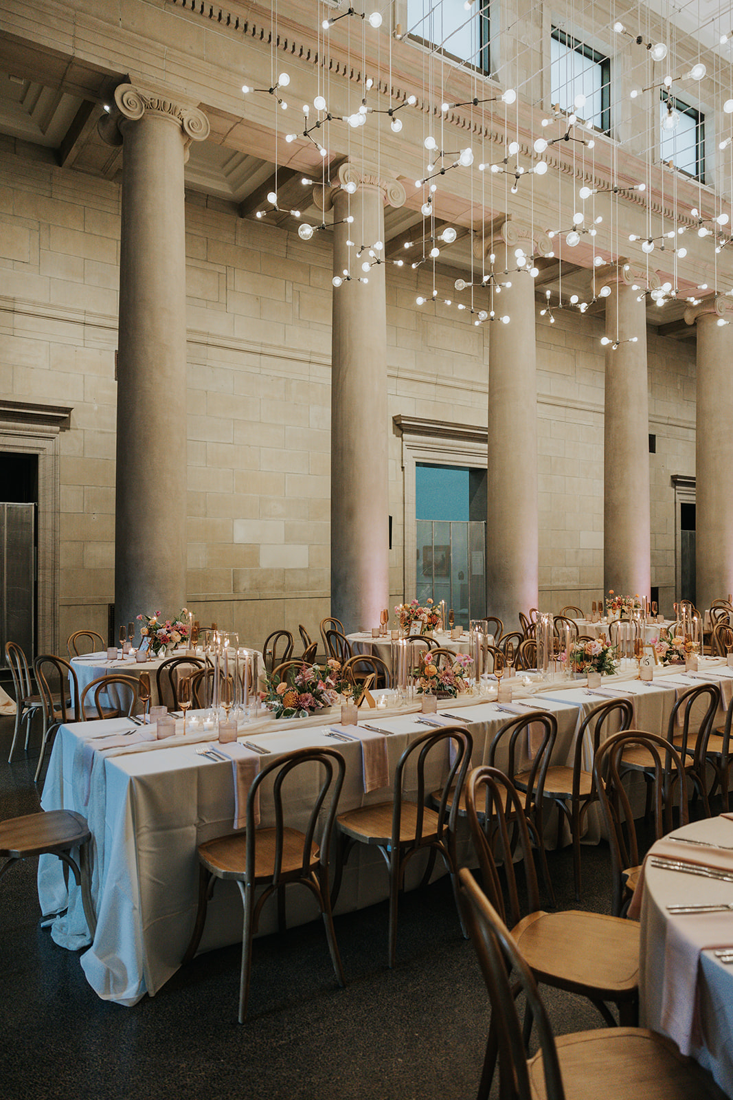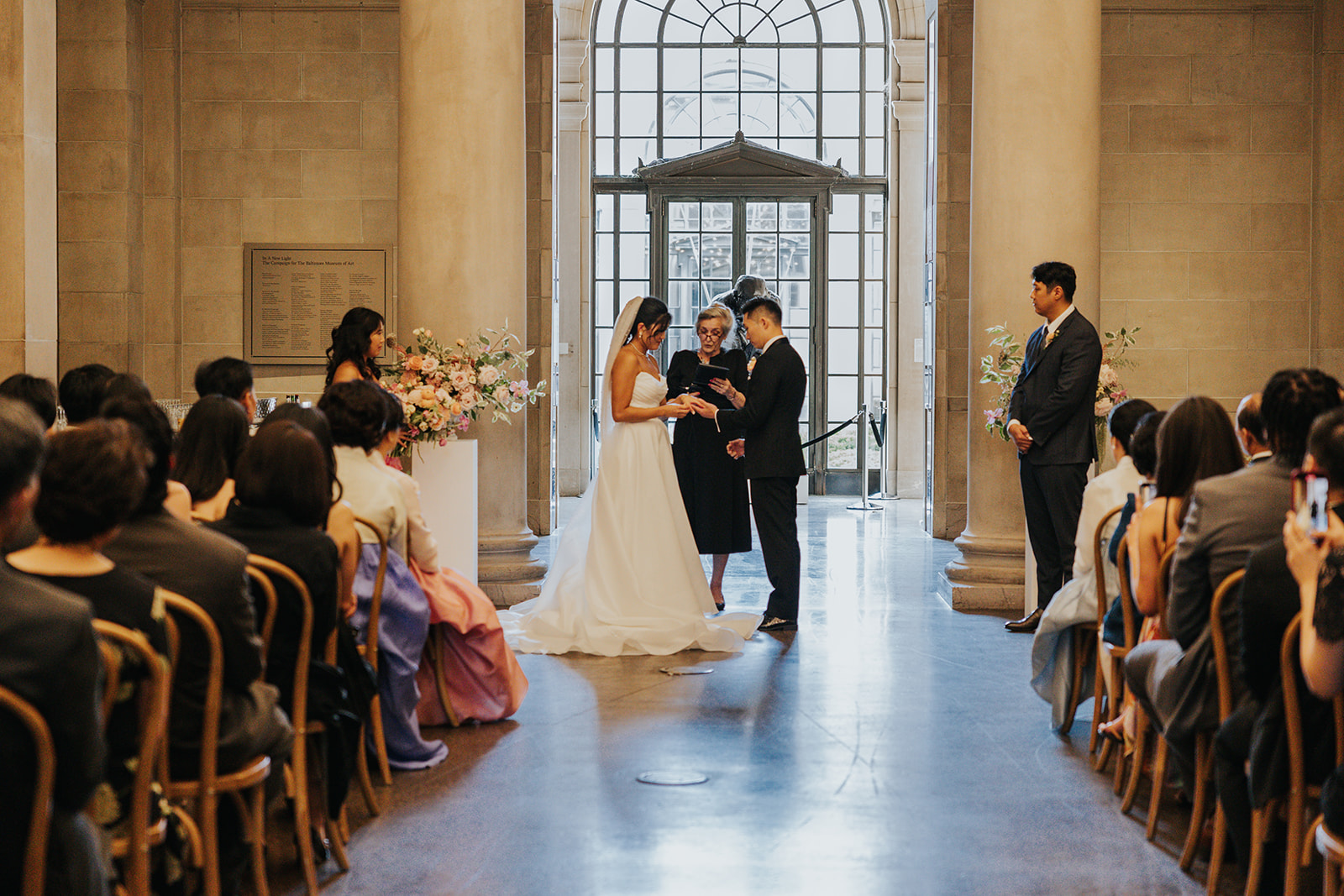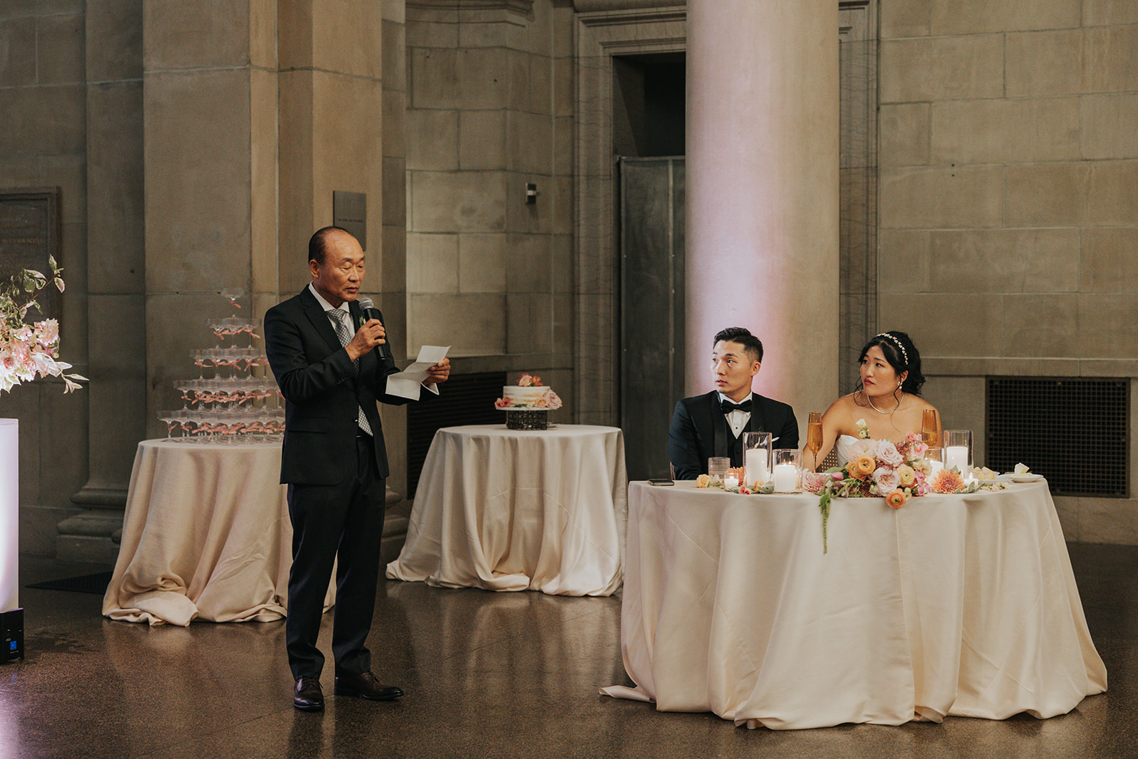 Suji & Kevin had so many lovely details in their elegant Baltimore Museum of Art wedding celebration. The soft color palette brought warmth throughout the marble space, as we used special touches like miss-matching colored glassware, mixed textures in the linens, and voluminous arrangements of summer-pastel flowers.