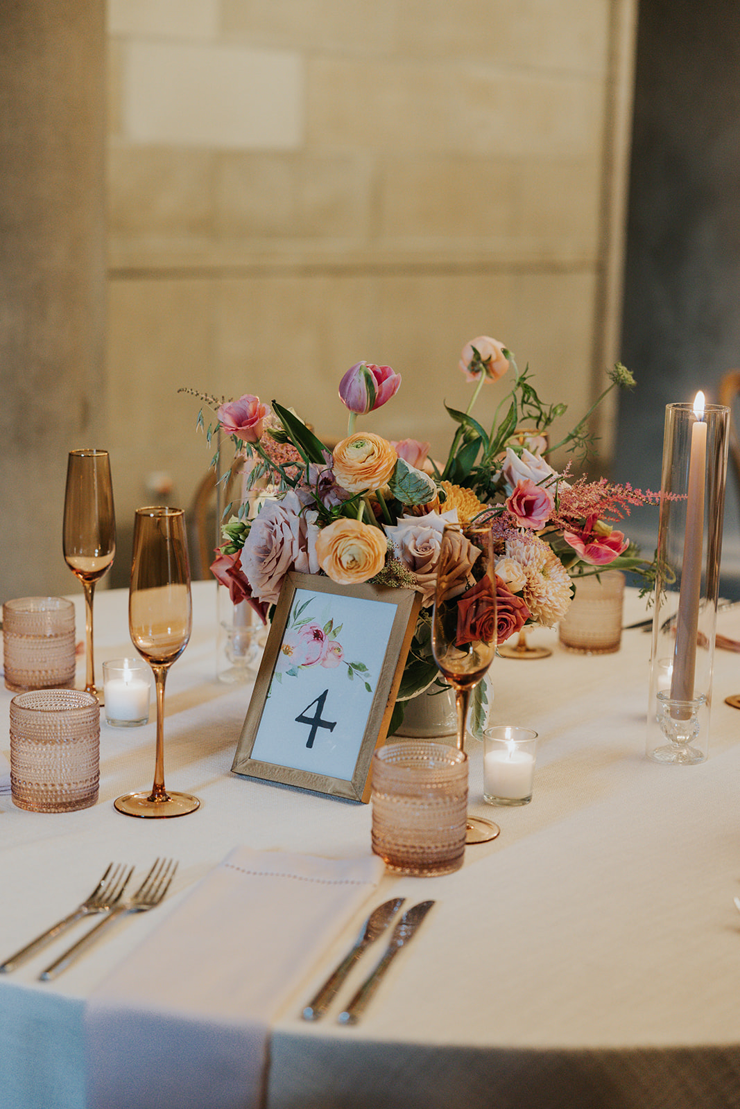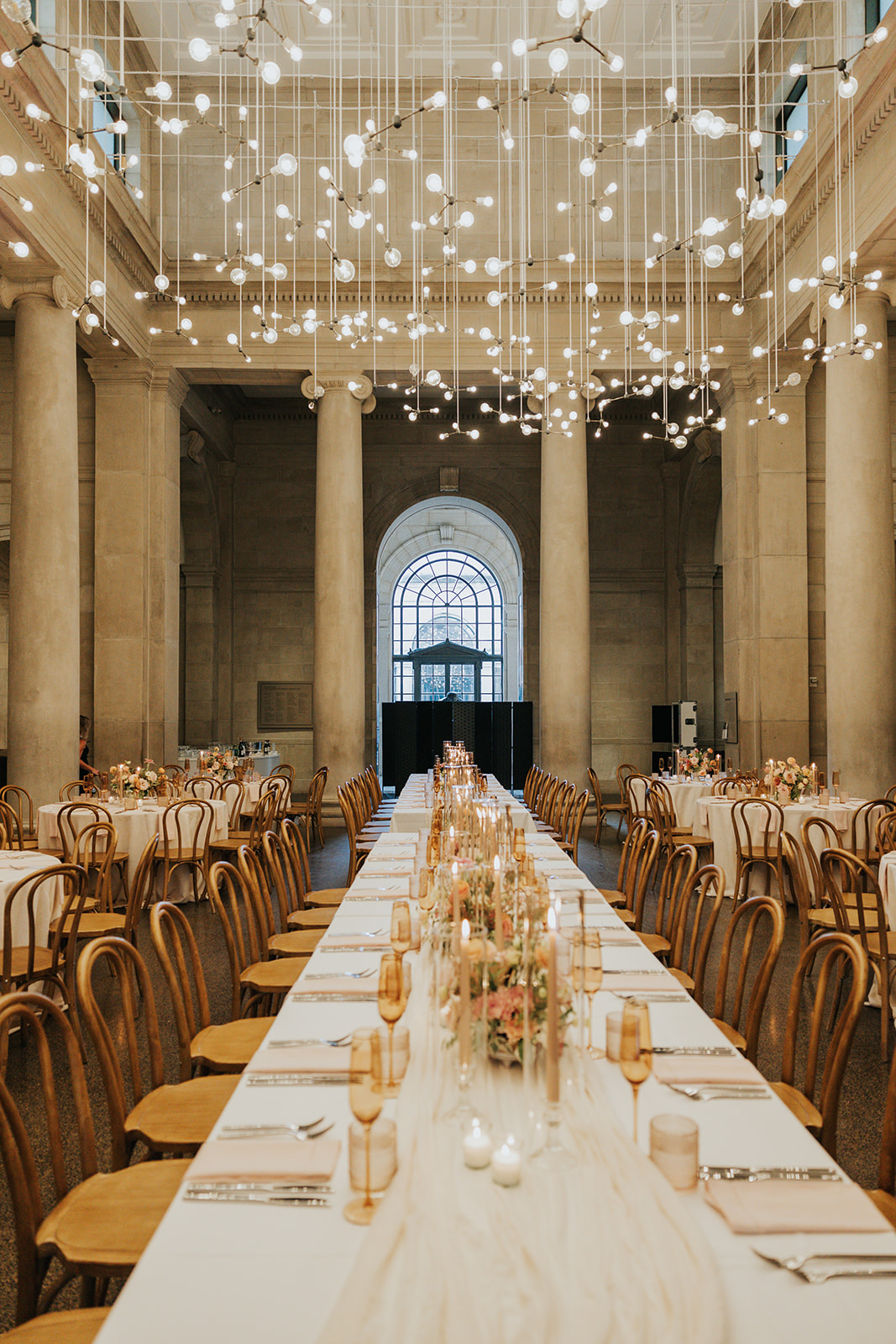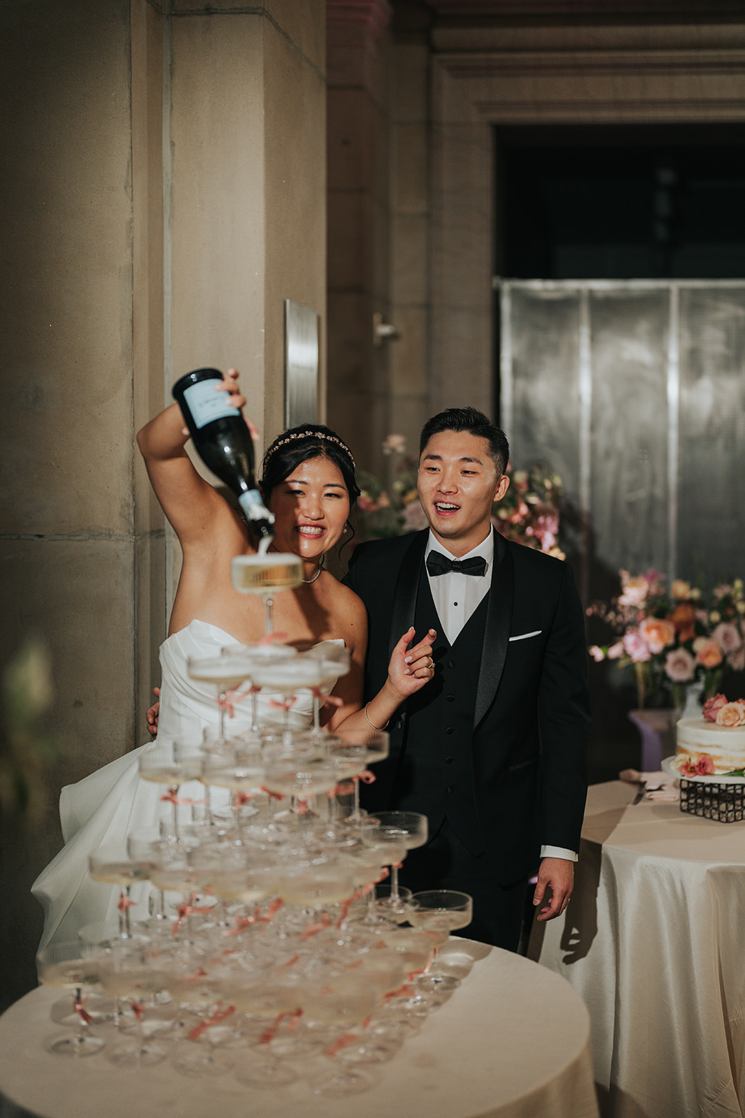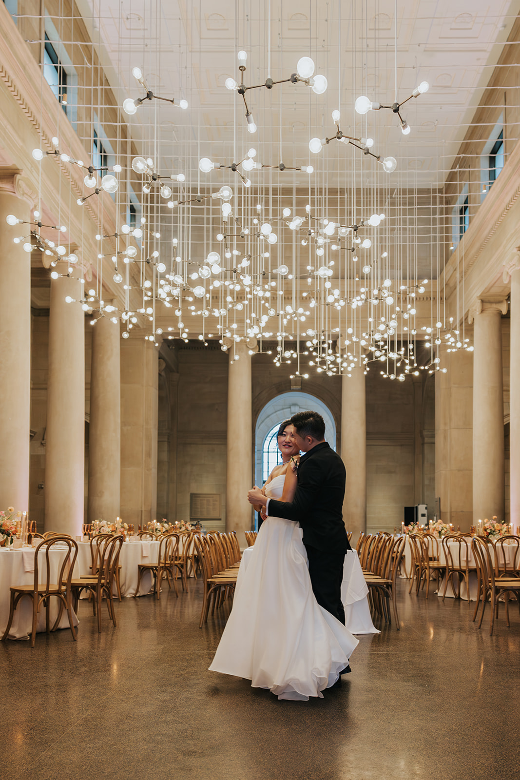 Suji & Kevin had so many lovely details in their elegant Baltimore Museum of Art wedding celebration. The soft color palette brought warmth throughout the marble space, as we used special touches like miss-matching colored glassware, mixed textures in the linens, and voluminous arrangements of summer-pastel flowers.
