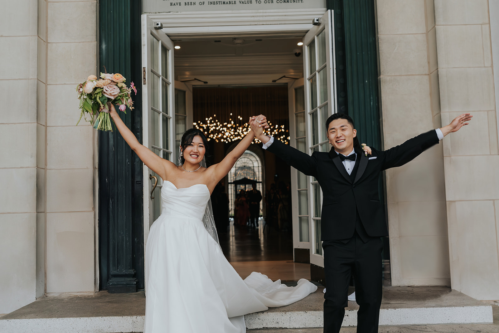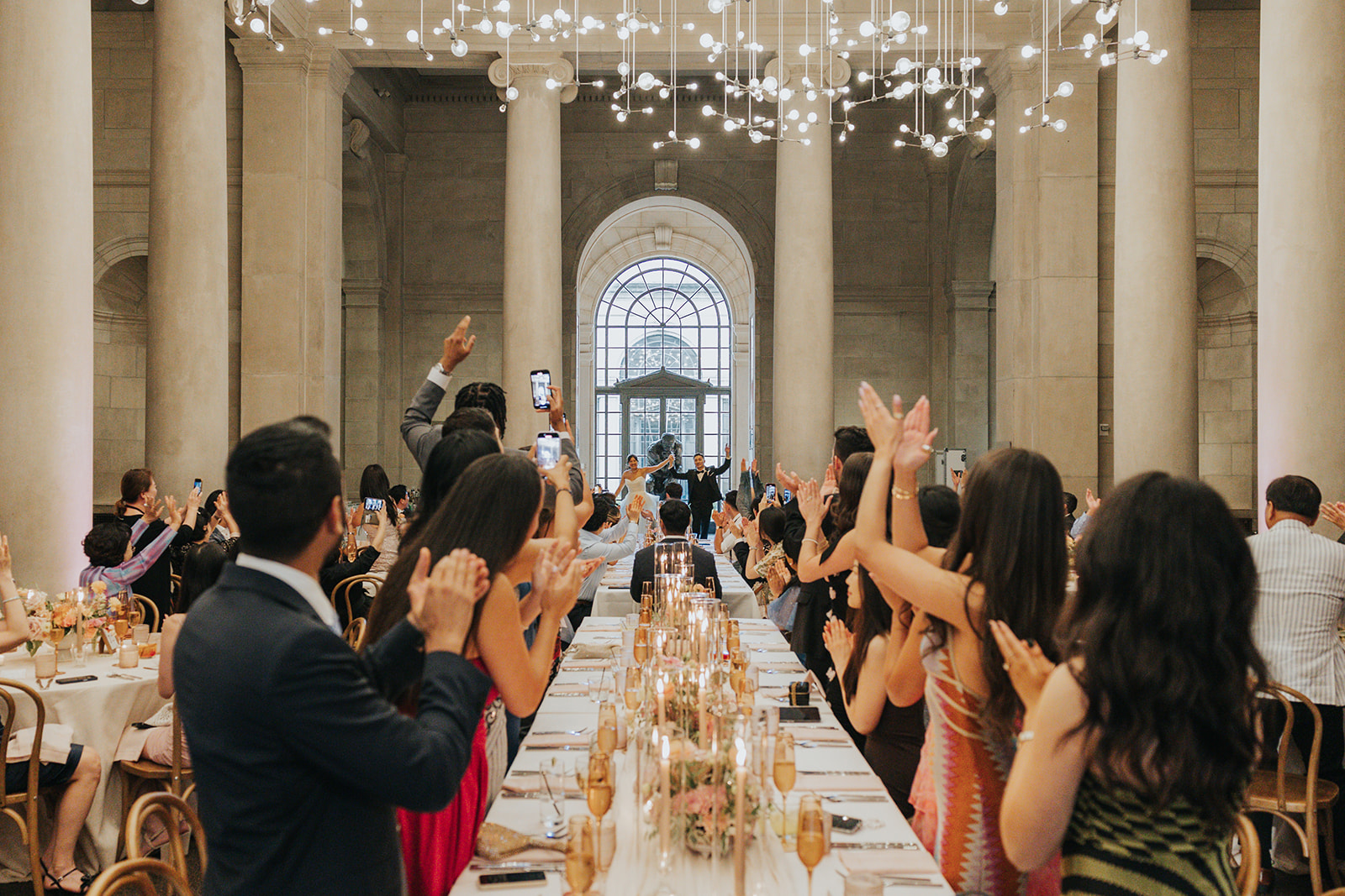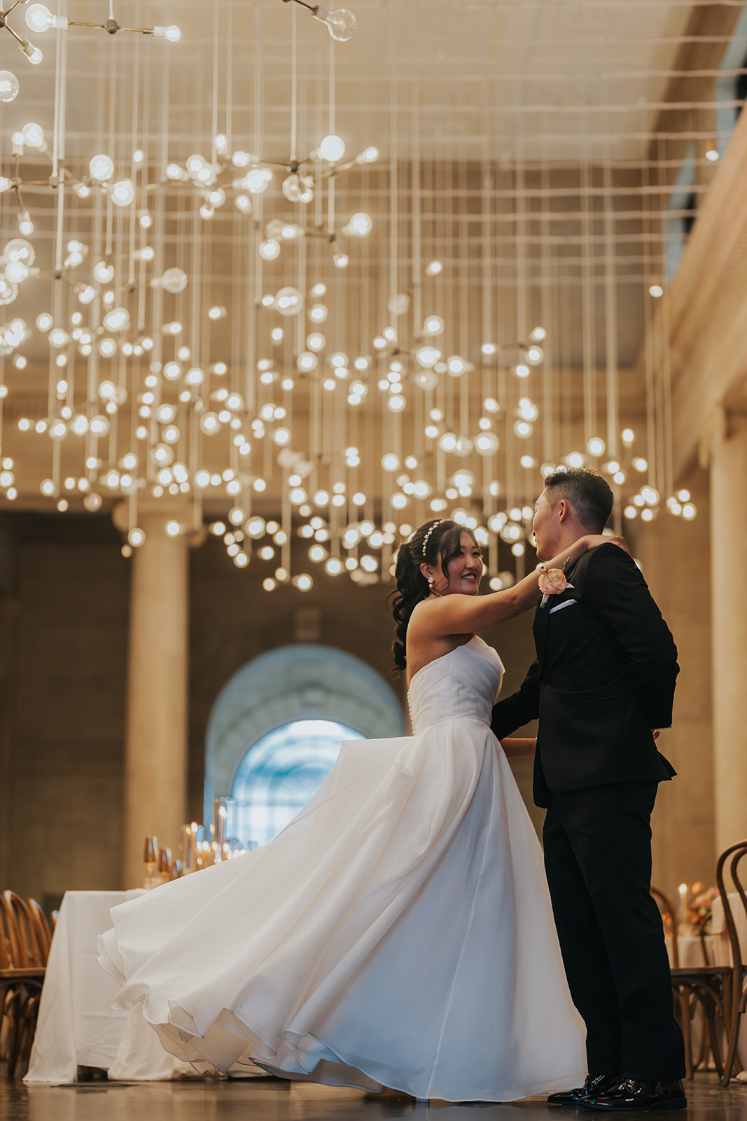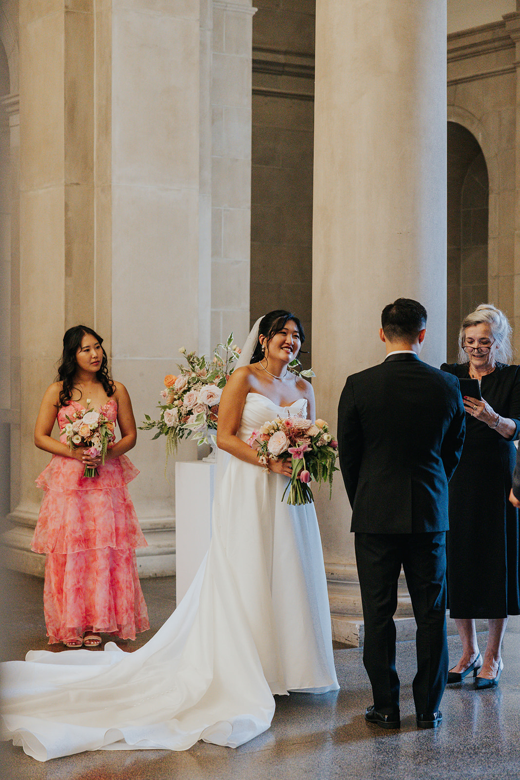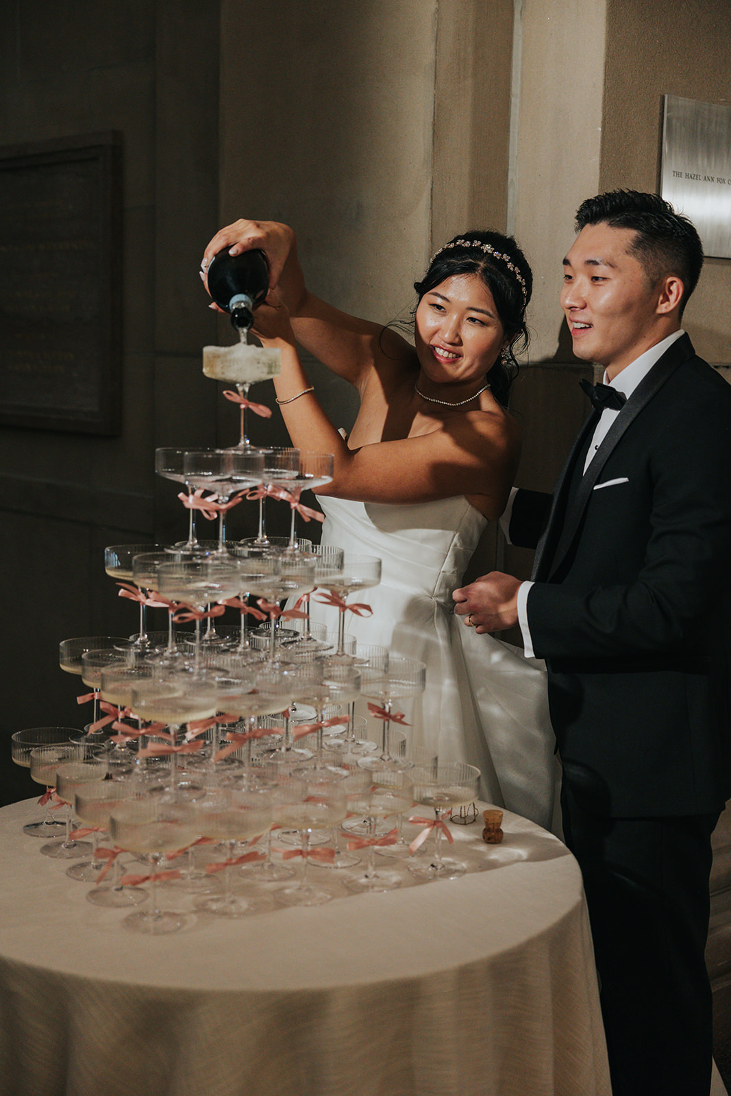 Suji & Kevin had so many lovely details in their elegant Baltimore Museum of Art wedding celebration. The soft color palette brought warmth throughout the marble space, as we used special touches like miss-matching colored glassware, mixed textures in the linens, and voluminous arrangements of summer-pastel flowers.