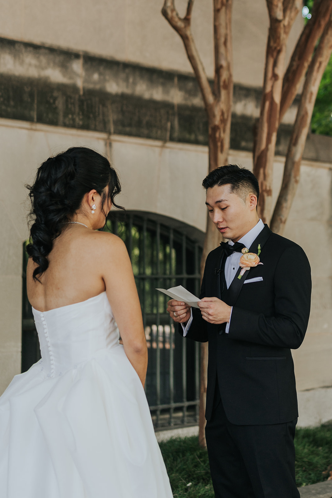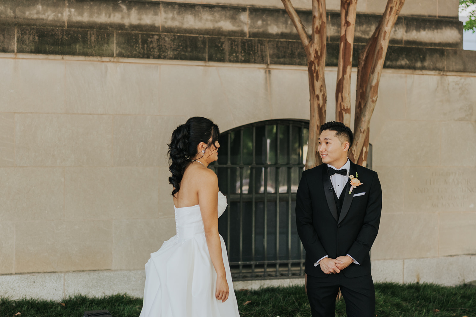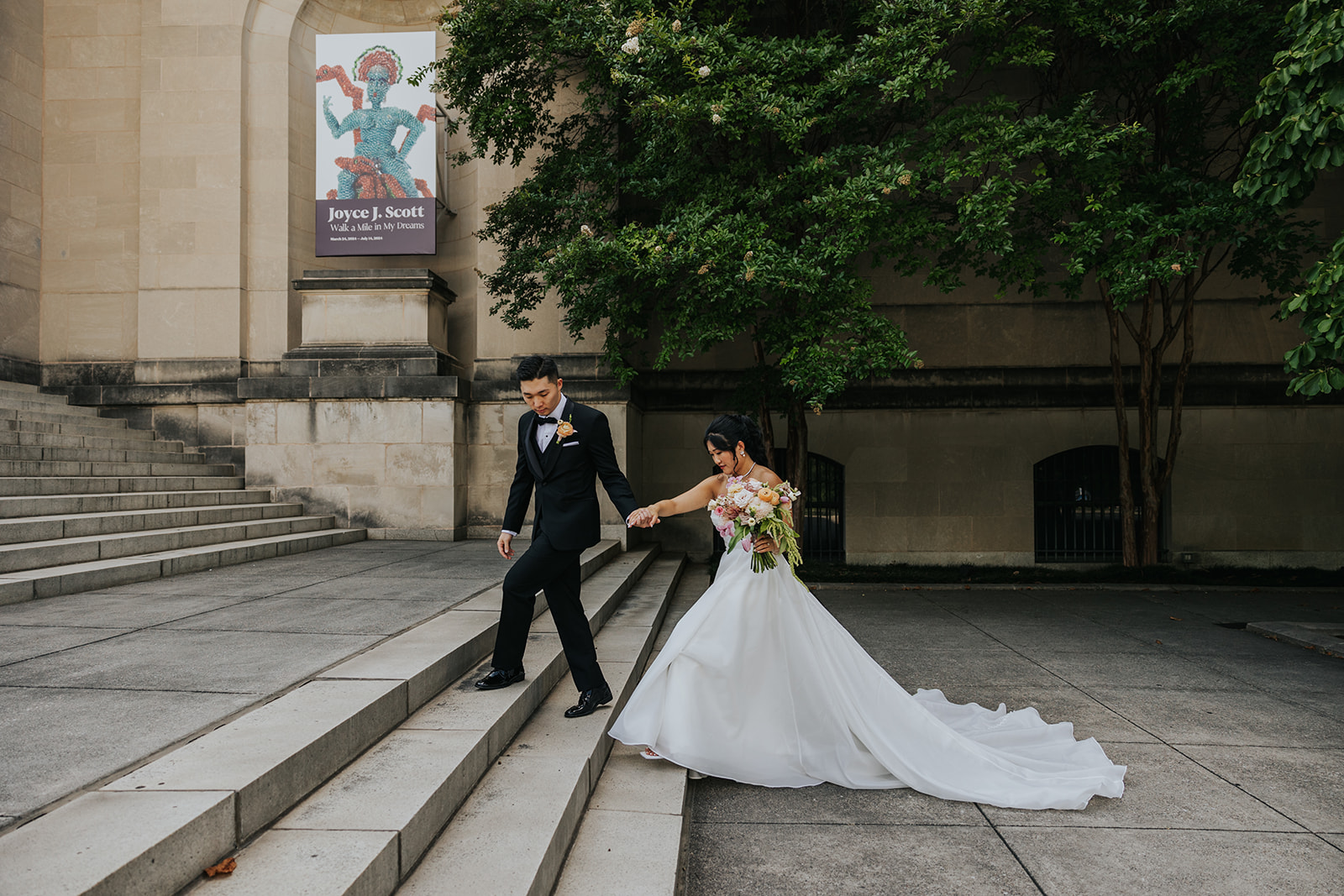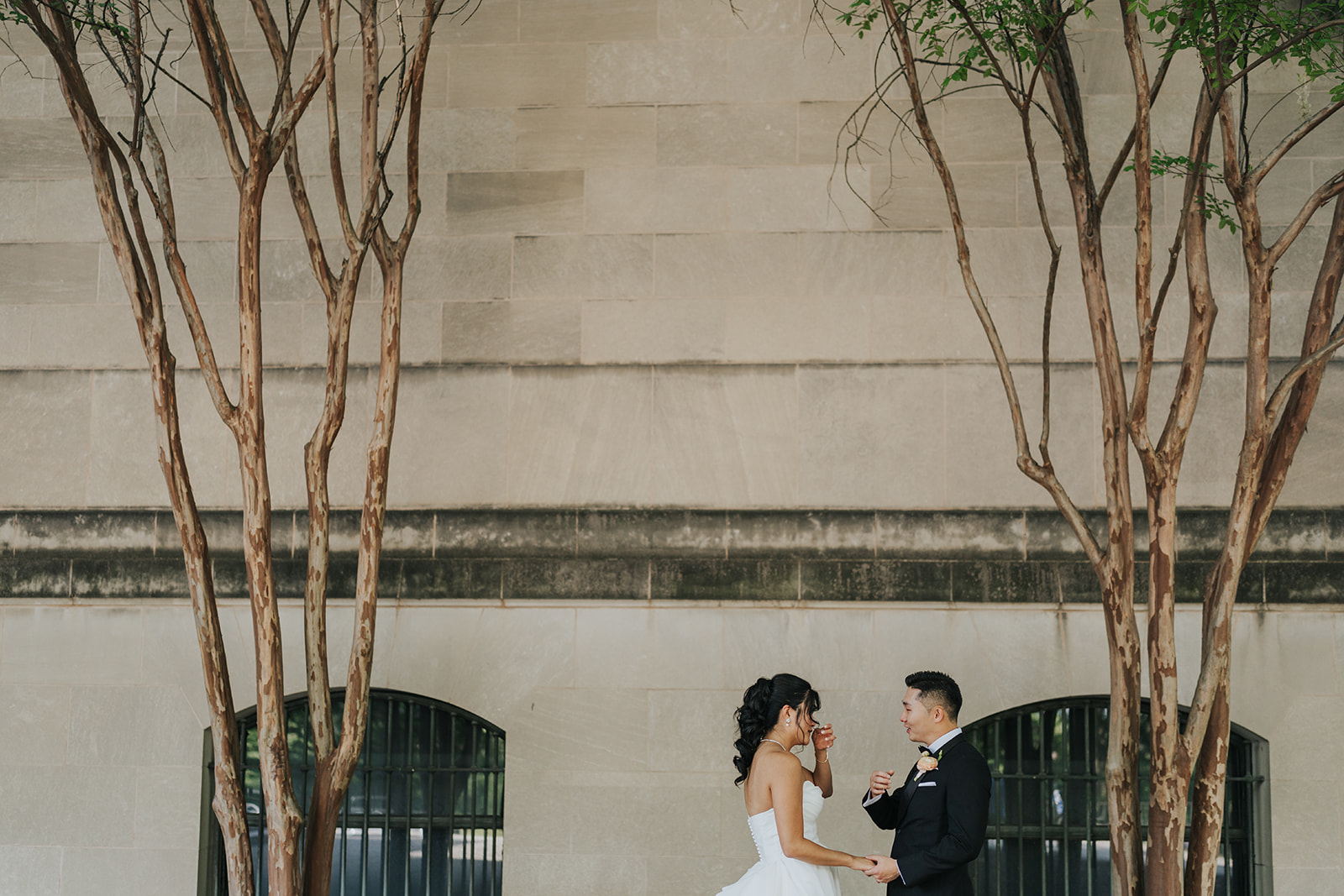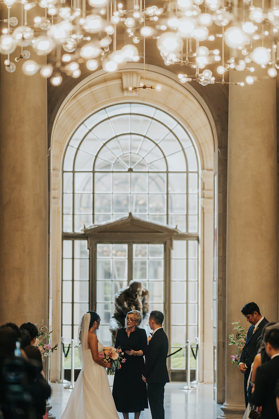 Suji & Kevin had so many lovely details in their elegant Baltimore Museum of Art wedding celebration. The soft color palette brought warmth throughout the marble space, as we used special touches like miss-matching colored glassware, mixed textures in the linens, and voluminous arrangements of summer-pastel flowers.